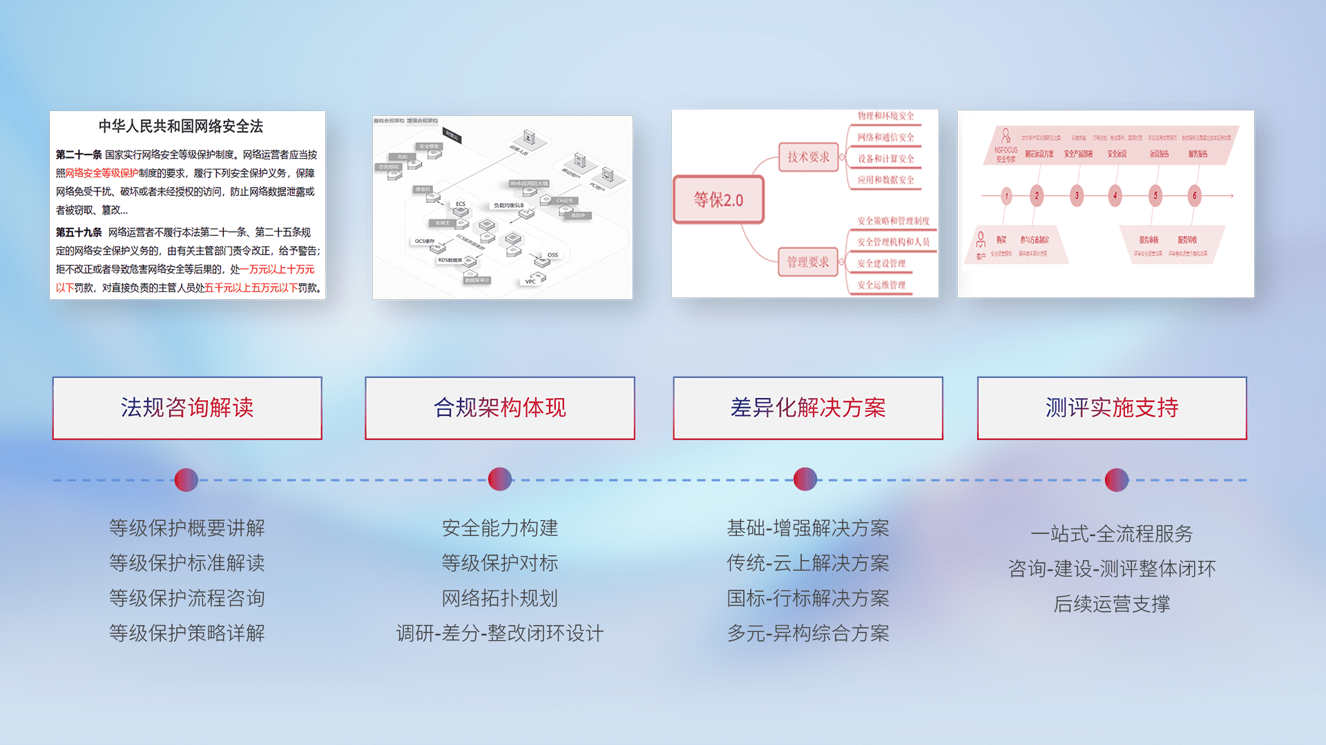 通过专业的法律咨询解读、、、、合规架构体现、、、、差异化解决方案、、、测试实施支持等服务,,,,为客户量身打造等保合规体系。。。。